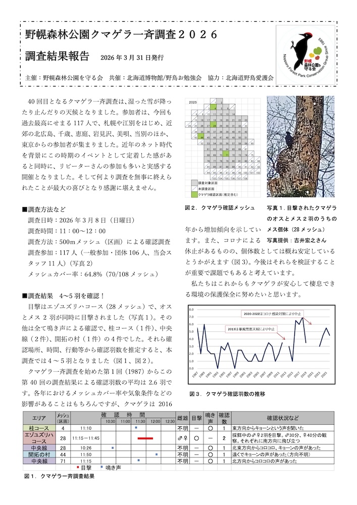 野幌森林公園クマゲラ一斉調査2026結果報告(共催) 当会が共催している「クマゲラ一斉調査」(野幌森林公園を守る会)が今年40回目を迎え、一般募集による調査としては今回が最後の開催となりました。毎年100人を超える参加者で行う一大イベントだけにとても残念ですが、形を変えてでも継続的に調査をおこなってほしいと願います。早速、結果報告がまとまりましたのでお知らせいたします。(調査結果報告参照)